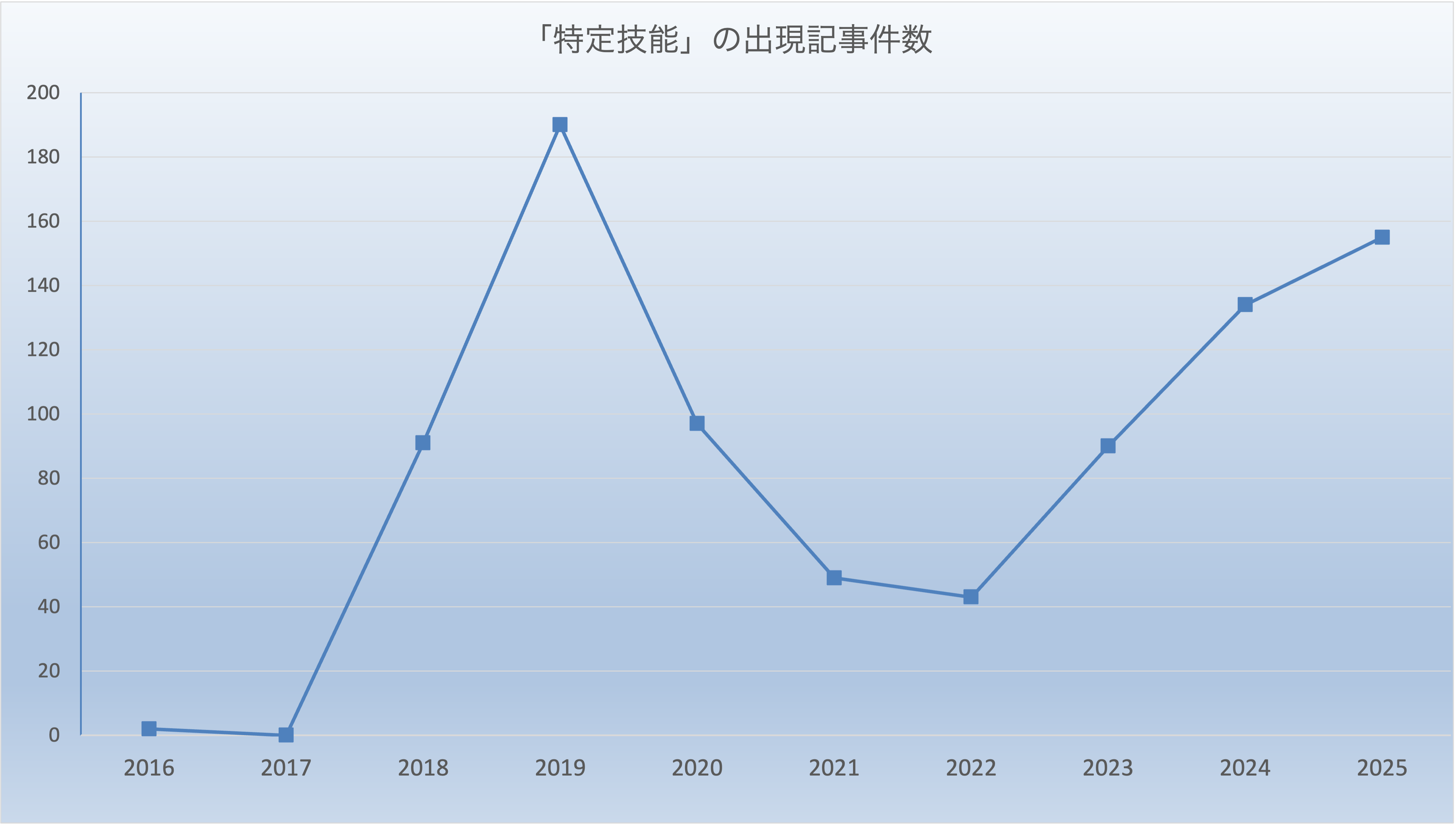 新聞記事データベースサービス「日経テレコン」で、日本経済新聞の朝夕刊に「特定技能」が現れた記事を検索すると、在留資格としての初出例は2016年1月10日付朝刊に掲載された「外国人とともに生きる(上)受け入れ拡大へ向け総合戦略を」という社説でした。この年の出現件数は2件で、改正出入国管理及び難民認定法(入管法)が可決・成立した2018年に91件、同法が施行された2019年には190件と急増しました。その後2桁が4年続き、2024年からは再び100件超の増加傾向になっています。同年は対象業種が12分野から16分野に増えた年でした。2026年1月には物流倉庫など3分野を新たに追加、19分野に拡大することが閣議決定され、外国人の技能実習制度に代わる「育成就労(17分野)」と合わせ、2028年度末までの受け入れ上限が123万1900人に設定されました。